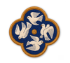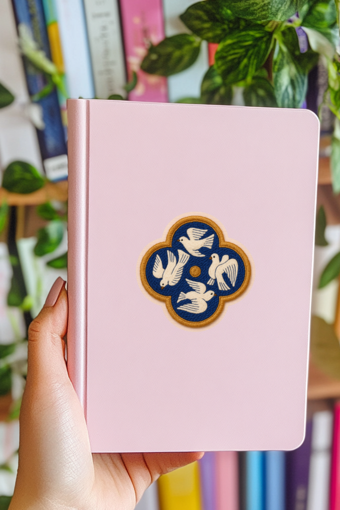 This elegant patch-style sticker features four cream-colored doves in flight, arranged in a clover-shaped design on a rich blue background with golden embroidered-look edges. A symbol of peace, unity, and balance, it brings a timeless and thoughtful touch to your sticker collection. Perfect for spiritual spaces, meditation journals, water bottles, laptops, or anyone drawn to symbols of calm and connection. Sticker is 3" on the longest edge, made of durable vinyl with a matte finish.