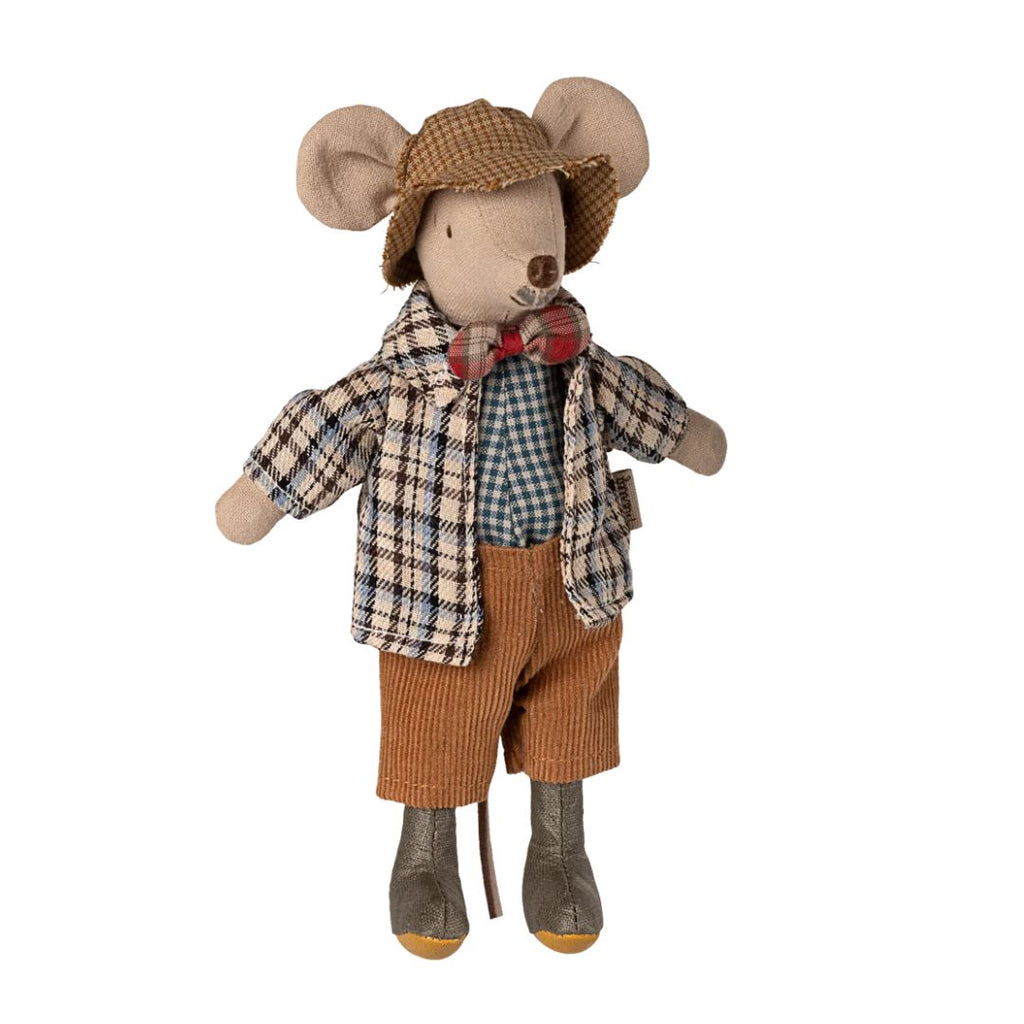 The granddad looks both wise and nice - he wears rubberboots, butterfly, pants and jacket and is always ready to cheer you up with all his many stories. The mouse has magnets in its hands.