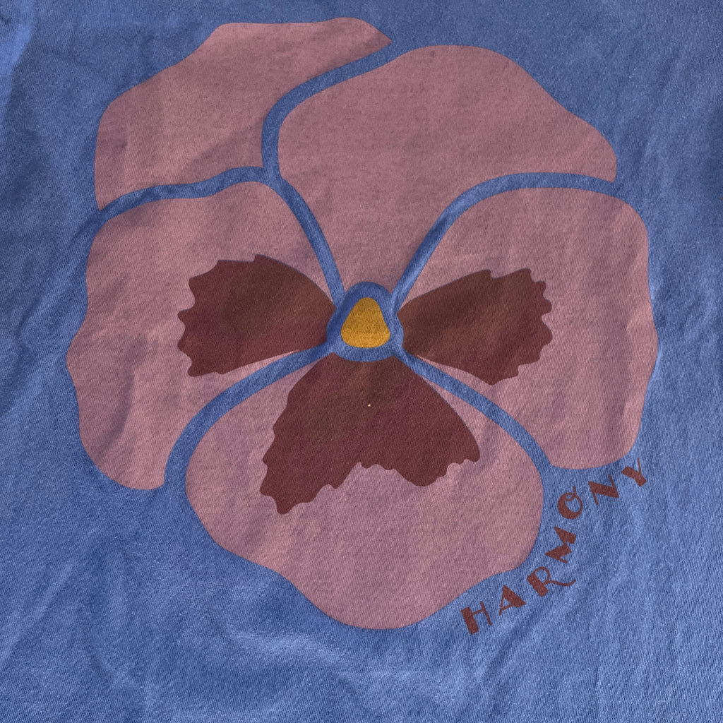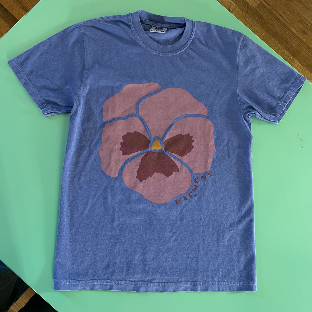 Show your love for Harmony by wearing our pansy!  This comfy garment dyed shirt is the perfect pairing for a me-made outfit or your favorite pair of jeans.