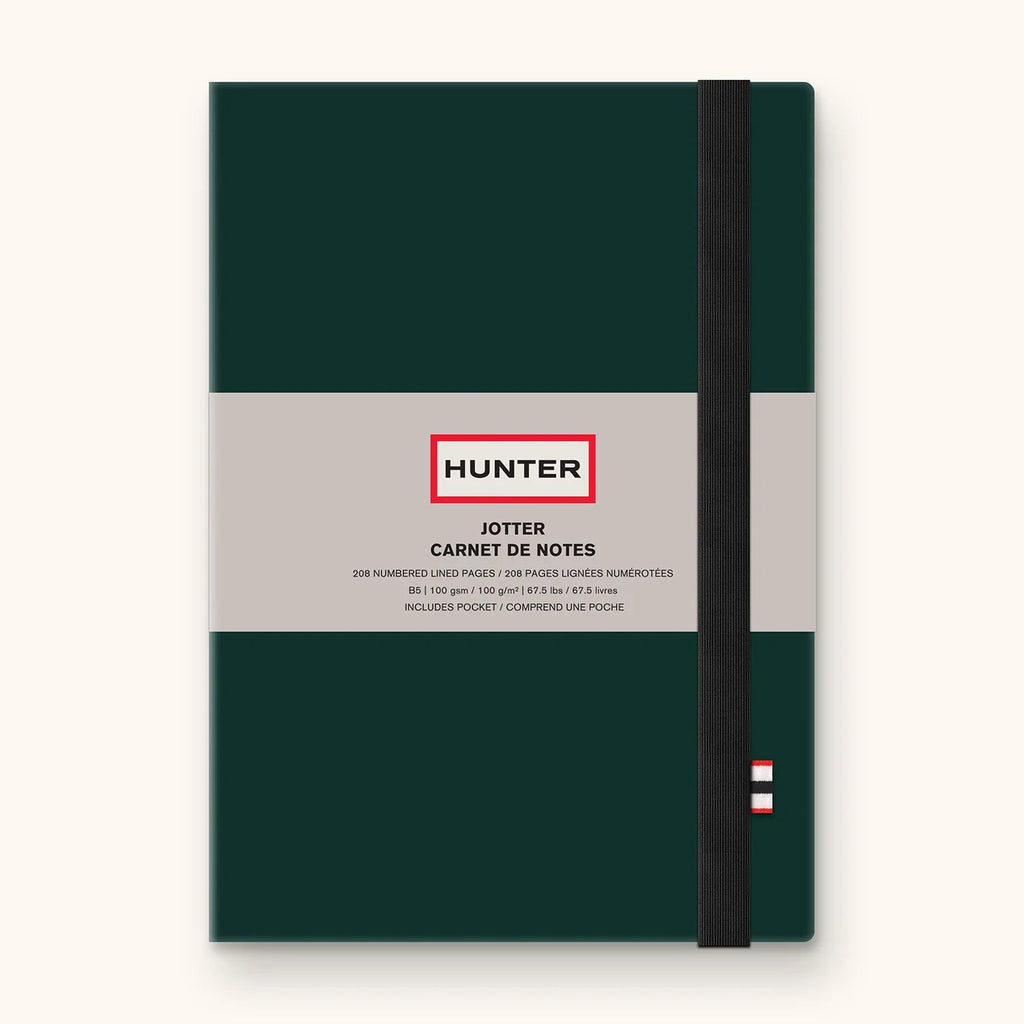 Designed for those who appreciate the classics, the Jotter from Hunter by Studio Oh! is a notebook that never goes out of style. Marrying the rich heritage of the Hunter brand with the creative craftsmanship of Studio Oh!, this notebook features 208 lined and numbered B5-size pages made from FSC®-certified paper, providing the perfect canvas for journaling, note-taking, or tracking to-dos. The sleek cover is secured with an elastic band that features the iconic Hunter pull tab—a nod to the iconic brand's legacy. Inside, a gusseted pocket provides a handy space for stowing loose papers. The Jotter is a standout in its category; a true essential for work, travel, and all your writing needs.
