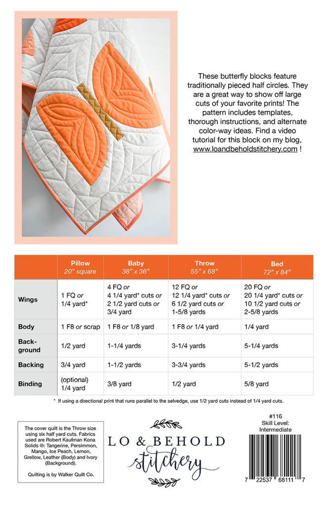 Metamorphosis is a block-based butterfly pattern that uses traditionally pieced half circles. This pattern is great for displaying large cuts of your favorite prints, or to display bold pops of color. There are 4 sizes: Pillow, Baby, Throw, Bed. The pattern includes helpful diagrams, thorough instructions, alternate color-way ideas and a coloring page to plan your quilt. This pattern is labeled as Intermediate.