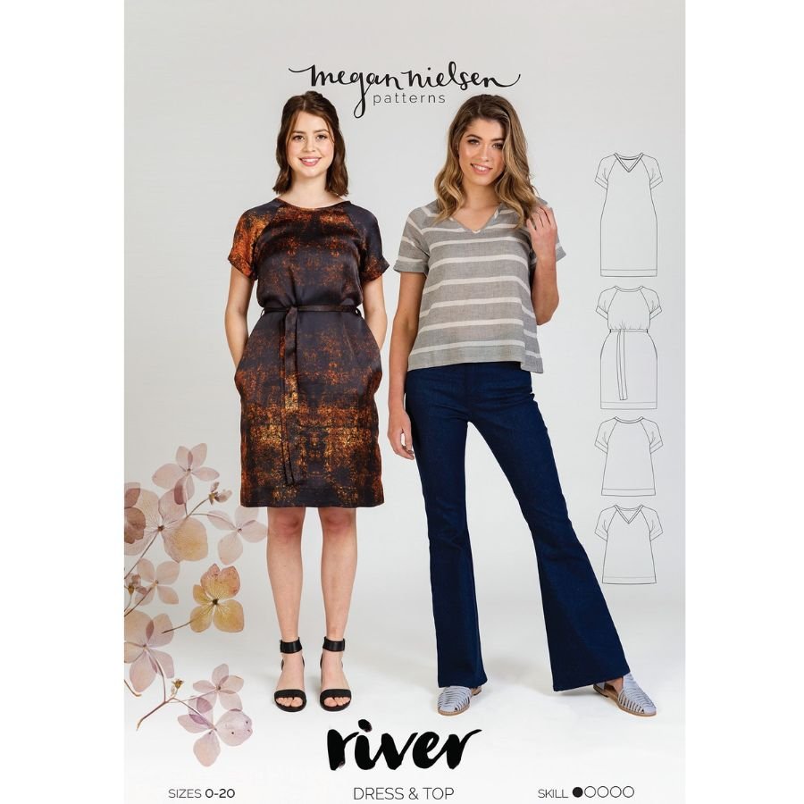 Reversible raglan dress or top that can be made in woven or knit fabrics. Pattern features a loose fit, optional pockets, and waist tie, as well as top and dress options. It can be worn with the V neck or the round neck side at the front.