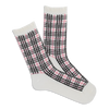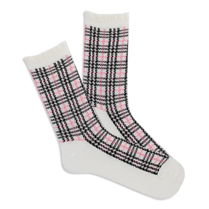 These socks mix classic plaid with a playful ruffled edge. The crisp plaid pattern features black and pink lines on white, while the heel, toe, and top band stay solid white for a clean look. Made from soft modal, they add a fun touch to any outfit without going over the top.