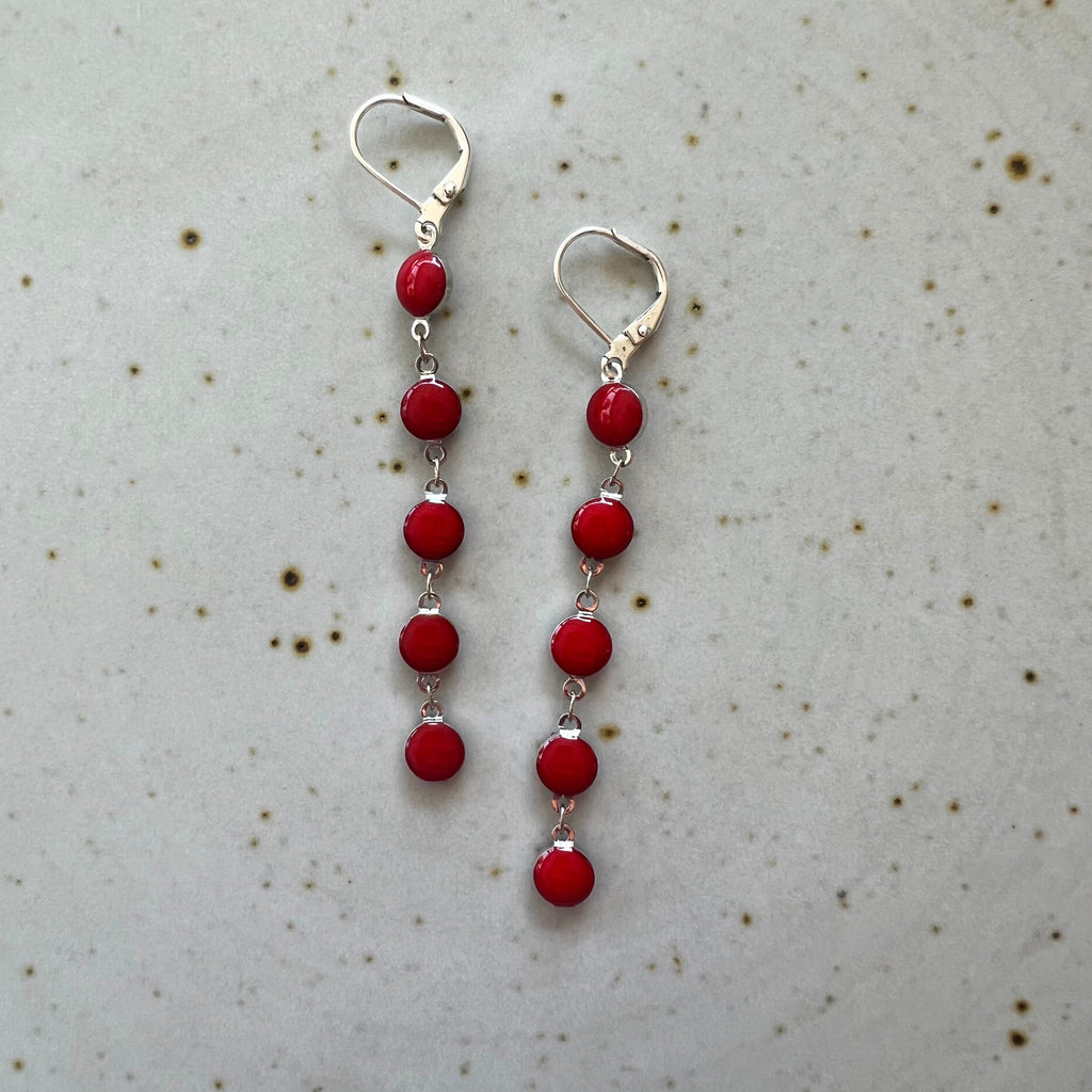 Bring a subtle and playful style with the Vintage Shay earrings. These playful dangle earrings combine bright red vintage enamel dots set in silver swinging from sterling silver-plated hoops, creating a fun and eye-catching look. These remind us of Shay with their cheery color and timeless style.