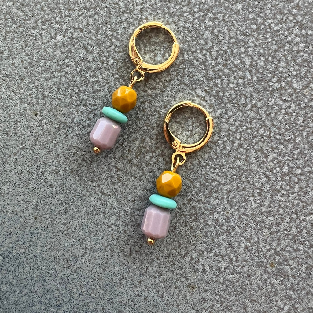 Meet the Zina Earrings—your new favorite everyday sparkle. Dancing from 18k gold-plated huggie hoops, these stacks of ochre, turquoise, and gray Czech glass beads add just the right pop of color. Simple and understated, they’re playful enough to brighten any outfit while staying effortlessly chic.
