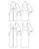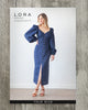 The Lora pattern is an empire waist dress with four views. All views have under bust gathers, a self-lined bodice, and twelve loop buttons along the center front. Views A and C have half-inch spaghetti straps at the shoulders while Views B and D have long puff sleeves. The dress is fitted through the waist and hips and has a straight fit through the skirt with Views A and B ending just above the knee and Views C and D hemmed a couple inches above the ankle.