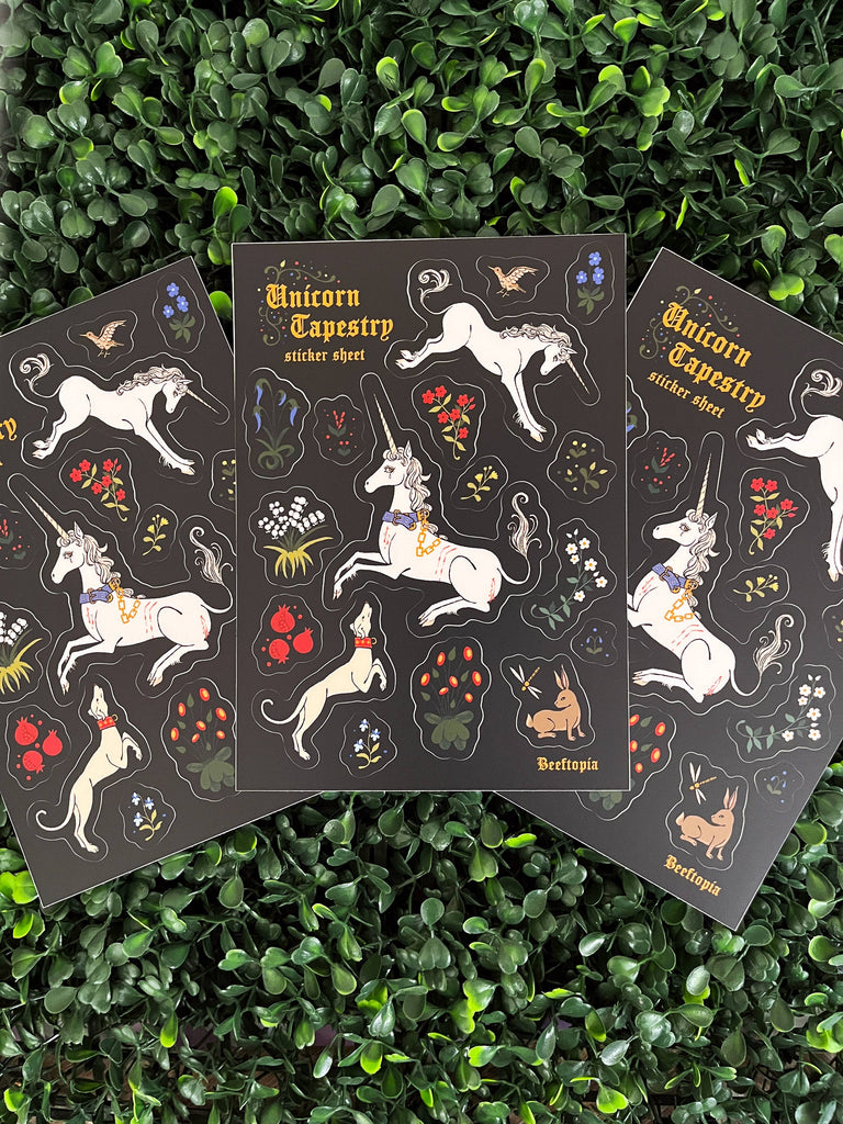 Inspired by the tradition of unicorn tapestries throughout art history, this sticker sheet features the iconic unicorn in captivity surrounded by a lush garden of medieval flowers.
