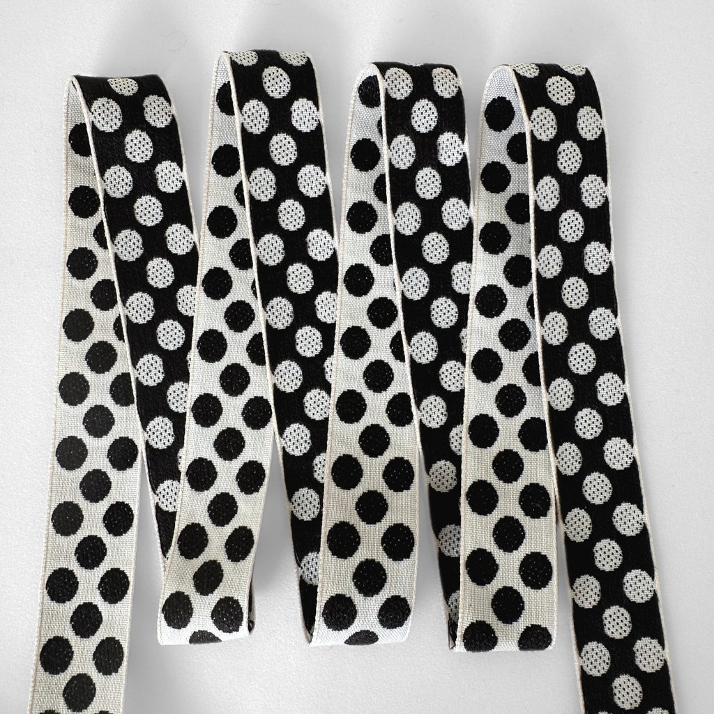1” wide vintage cotton jacquard ribbon in a black and white polkadot pattern.
