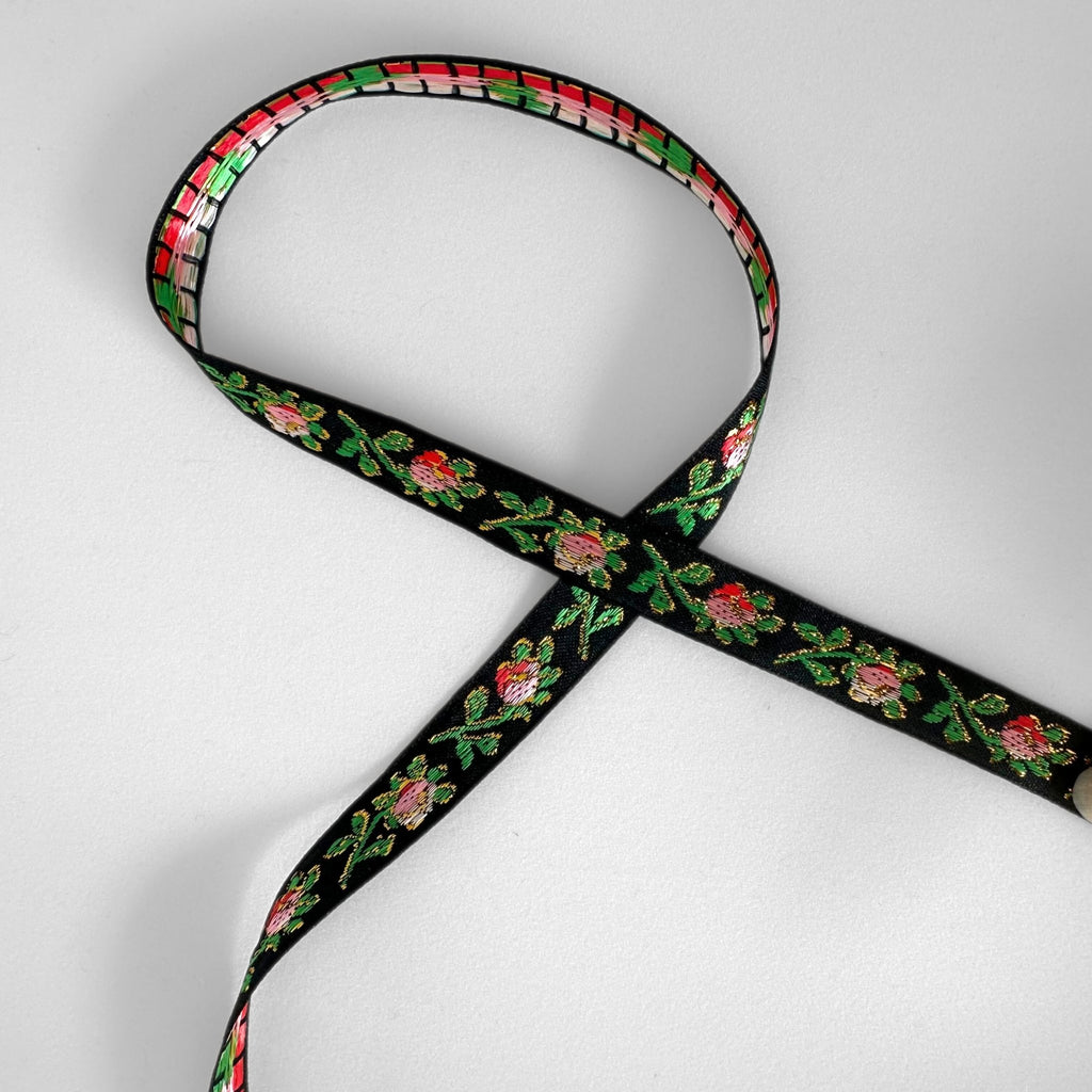 0.5” wide vintage jacquard ribbon featuring a charming floral design on a black background with copper metallic accents.