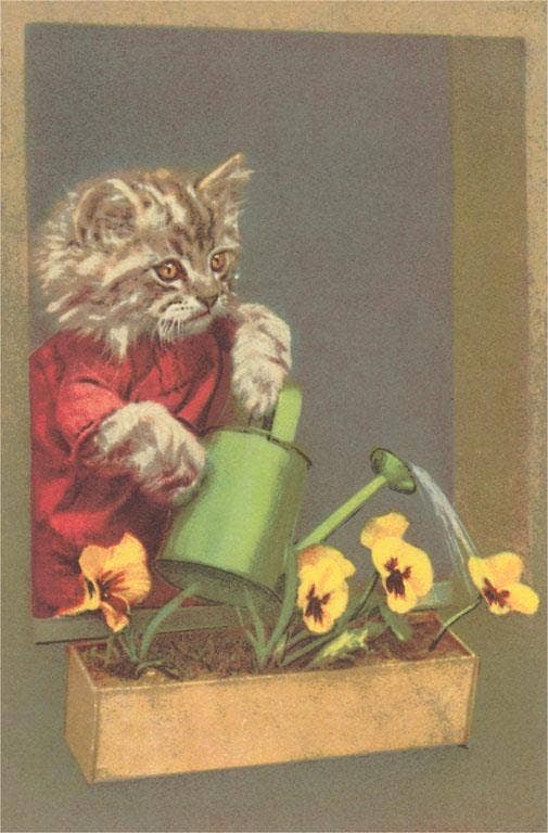 Vintage Postcard / Dressed Kitten Watering Pansies