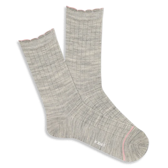 These charcoal wool blend socks keep it simple with a classic ribbed look and cozy feel. The scalloped cuff adds a fun pop of color. Warm and comfy, they’re perfect for everyday wear with a playful twist.