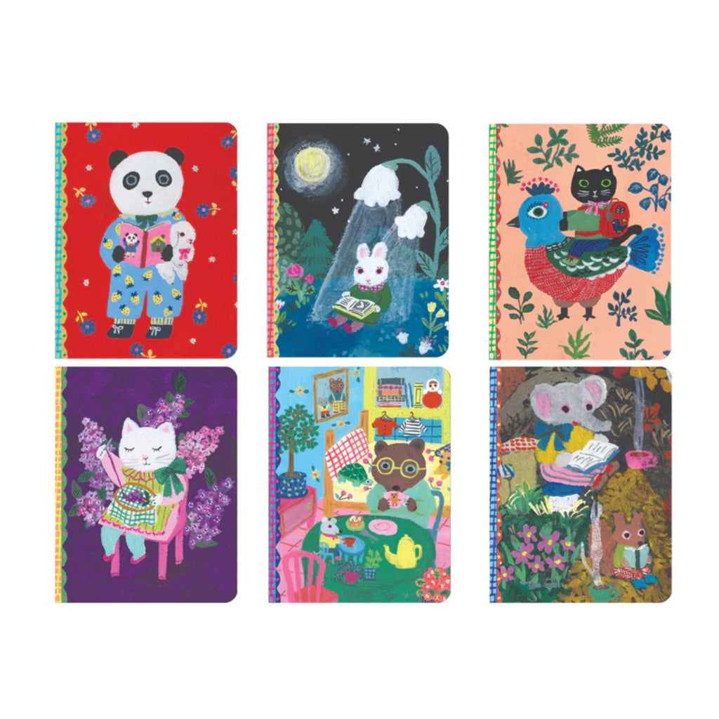 An assortment of small journals with playful artwork by Yumi Kitagishi. Display of 30 journals includes 5 units of 6 styles. Pairs well with Yumi Small Pencil Assortment.